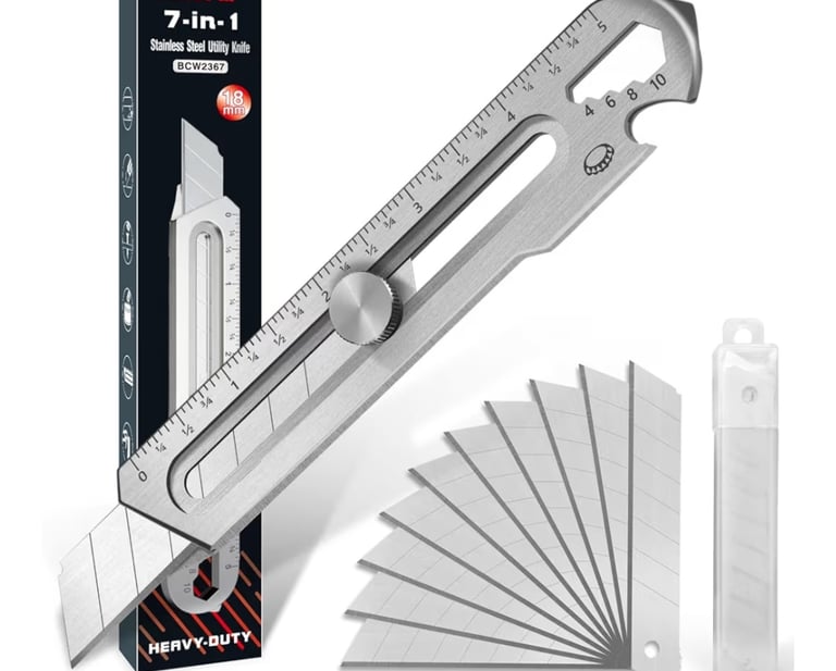 The 7-In-1 Multipurpose Utility Knife is a practical cutting tool designed for precision, durability, and everyday versatility. Built with a retractable blade system and a strong stainless steel body, it is suitable for various cutting tasks at home, in workshops, or on job sites.