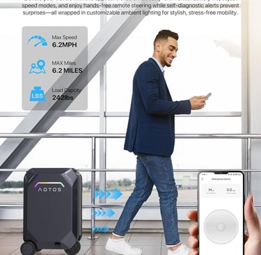 The AOTOS Smart Rideable Carry-On Luggage is an innovative cabin suitcase designed to combine mobility, storage, and smart travel functionality. Built for airport environments, it features a rideable electric system, app-controlled navigation, and a durable zipperless hardshell structure that meets standard airline carry-on size requirements.