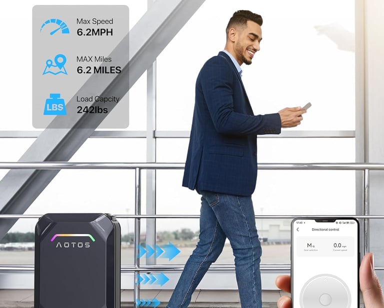 The suitcase connects to a mobile application that allows users to control speed and direction without the need for a physical remote. This enables precise maneuvering in crowded terminals and confined airport spaces.