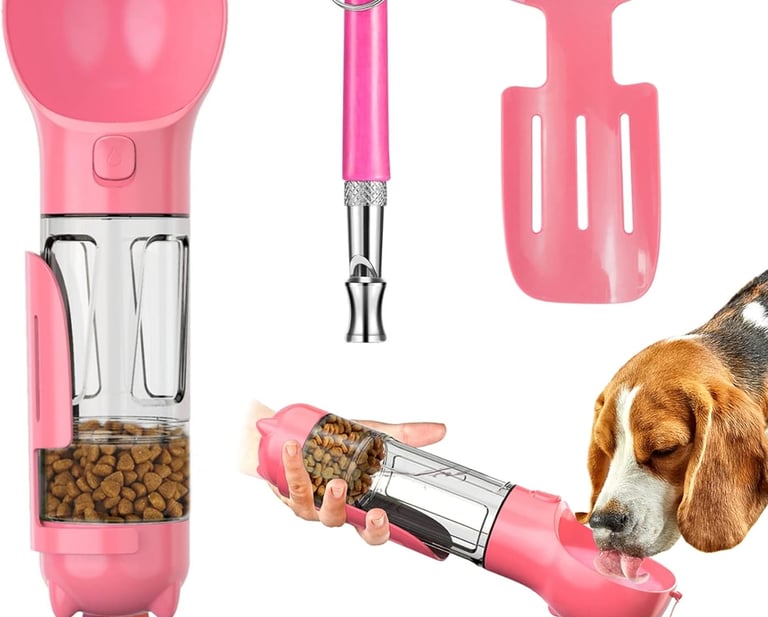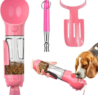 A compact 4-in-1 portable hydration and feeding system designed for pets during outdoor activities. It integrates a water cup, food storage container, waste collection shovel, and waste bag compartment for convenient travel use. Includes a whistle for basic dog training during walks.