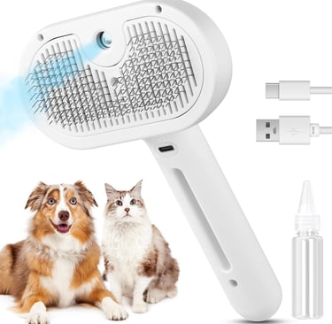 A multifunction grooming tool featuring mist spray, de-shedding stainless steel bristles, and a self-cleaning release system. Designed for long and short-haired pets to reduce shedding, static, and loose fur while keeping coats clean and soft.