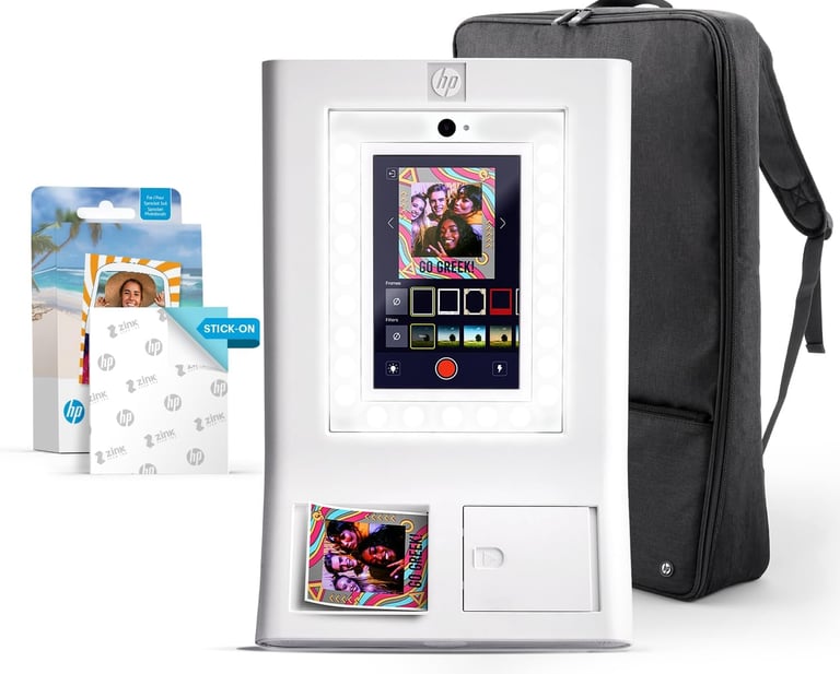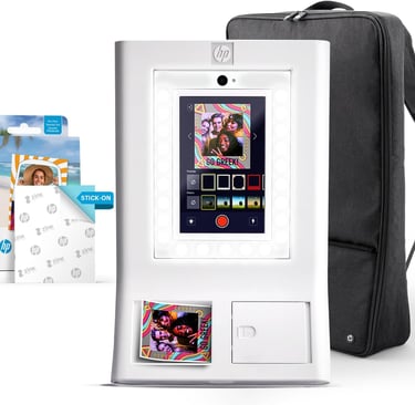 The HP Sprocket Photo Booth Machine is a portable all-in-one photo booth printer designed to bring instant photo printing and digital sharing to parties, weddings, birthdays, and special events. Built with an interactive touchscreen and wireless connectivity, it allows guests to capture, customize, print, and share photos in seconds without the need for ink cartridges.