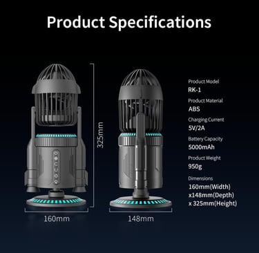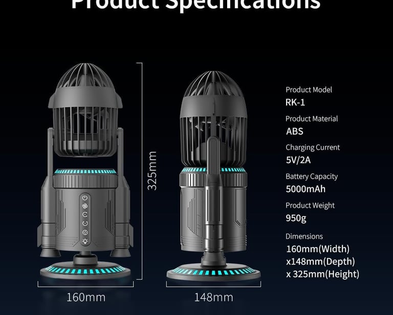 The RuoFeng Creative Rocket Desktop Fan is a themed tabletop cooling device featuring a sci-fi rocket aesthetic combined with humidification spray, multi-direction oscillation, and LED ambient lighting. Designed for office desks, bedroom environments, and display setups, it operates quietly on a rechargeable power system suitable for portable indoor use.