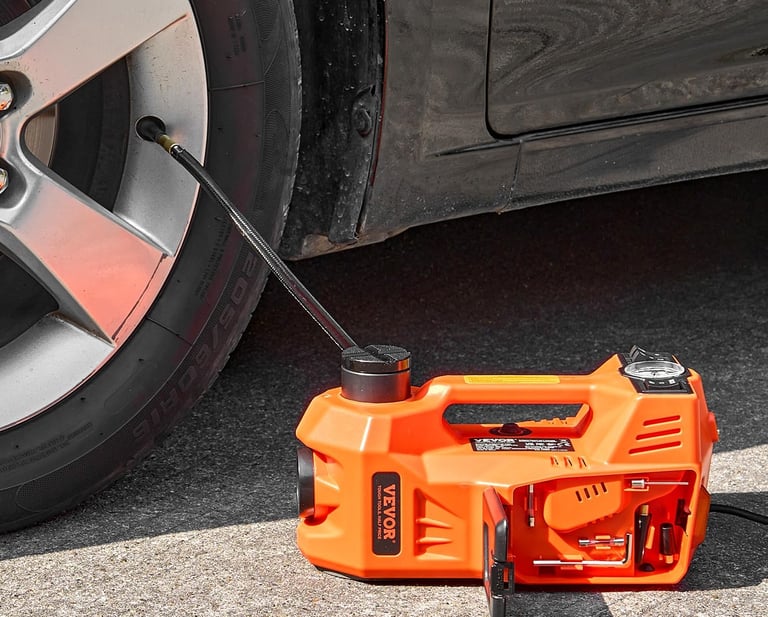 The VEVOR Electric Car Jack (5-Ton / 11000 lbs) is a multifunctional automotive tool engineered for roadside emergencies and maintenance tasks. Designed as a compact scissor-lift system with integrated tire inflation capability, it allows drivers to lift vehicles and restore tire pressure quickly without manual effort. Equipped with LED illumination, safety accessories, and dual power input options, it supports sedans, SUVs, and trucks with ground clearance variations.